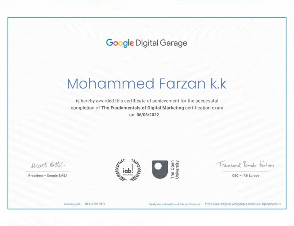 Hello, I’m Mohammed Farzan, a Google Certified Digital Marketing Strategist based in Kerala and Bangalore, India. I specialize in helping businesses elevate their growth through effective online marketing strategies.